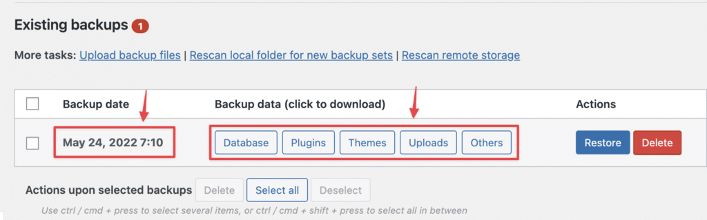 - Vào Settings > UpdraftPlus Backups.